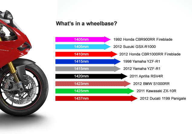 While most of the modern superbikes sit within a few millimetres of each other, the bike that stands out is Ducati's 1199 Panigale. It looks tiny but its 1437mm wheelbase is longer than Triumph's Daytona 955i or Suzuki's SV1000S, both bikes were hardly known for their apex-hugging handling.