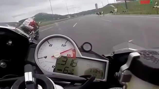Aboard a BMW S1000RR, the filming rider and his friend fly by the cows as they step out onto the busy motorway. Luckily the running cows hadn't yet reached the middle of the road and so a colision was avoided.