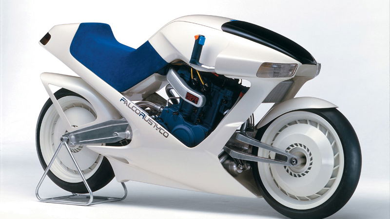 In 1985 Suzuki produced this concept, the Falcorustyco. Really? It had a 500cc square four water-cooled engine with 16 valves and 3 camshafts, no gearbox and relied on hydraulic pumps to provide final drive to both wheels. Front and rear swinging arms provided hub-centered steering and the bike had electromagnet brakes.
