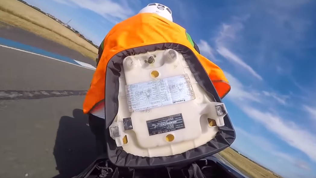 When the biker's pillion seat comes loose on a track day at the Isle of Man's Jurby Motordrome, instead of flying off the bike as you would expect it to, it sticks to him as he continues to speed around the track.