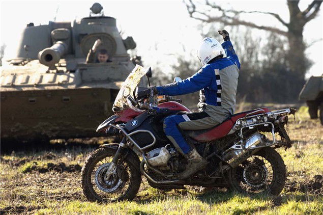 We are at Tanks-a-Lot, a company that has more military hardware than you could shake a stick grenade at, and our competition for the day is the old Cold War enemy’s assault weapon, a Russian S21 Grozdilka. Next to it our two-wheeled tank looks very small, but the Germans are fairly adept at warfare and the R1200GS Adventure was built to scrap. Although seeing the size of the tank ruts we swiftly removed the rear mudguard. “You want to take that front one off ‘n all”, came a piece of advice from one of the lads inside the tank ‘hanger’. Seeing the size of some of the ruts we knew he was right, but that meant removing the front wheel and that would have been cheating.