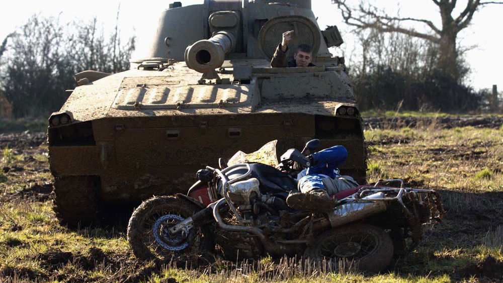 "I’m strictly off road, I find riding on the road too dangerous – that’s why am I racing around inches away from a tank,” our challenge rider Clive Town of the BMW Off Road School grunts as he heaves on the bars of the Beemer after a track-size rut grabbed his front wheel and stopped all forward motion. “That thing doesn’t move too far sideways does it?” he asks Liam James, whose head we can just about see poking out of the driver’s hatch.