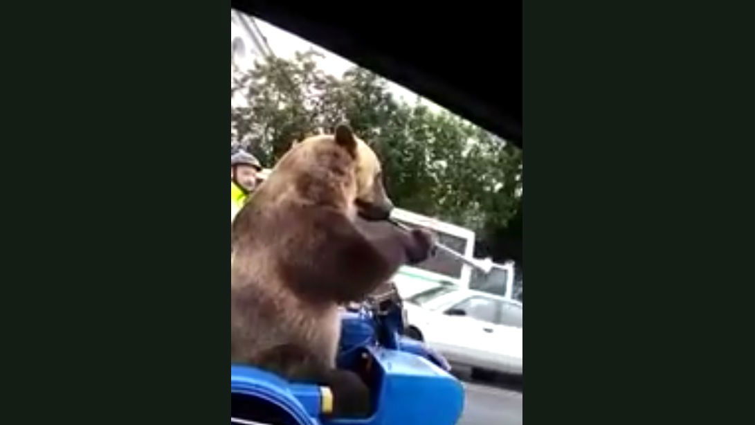 WHAT’S stranger than a bear riding in a sidecar in a traffic jam? A bear in a sidecar in a traffic jam playing a bugle, of course.