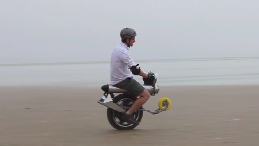 The main wheel measures 17-inches, while a smaller stabilizer wheel sticks out the front for emergency use. The monocycle features a mismatched array of components, including a jet intake from an old aircraft, a Kelly motor controller usually found in electric boats, and self-balancing components packed into a 1950s Ural motorcycle headlamp pod.