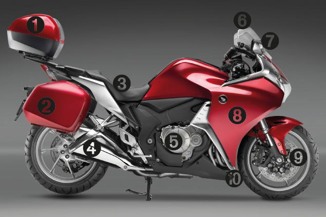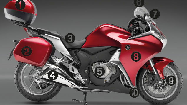 For a bit more wind protection there’s a taller screen and hand blisters. Optional heated grips also point towards the VFR’s tourability