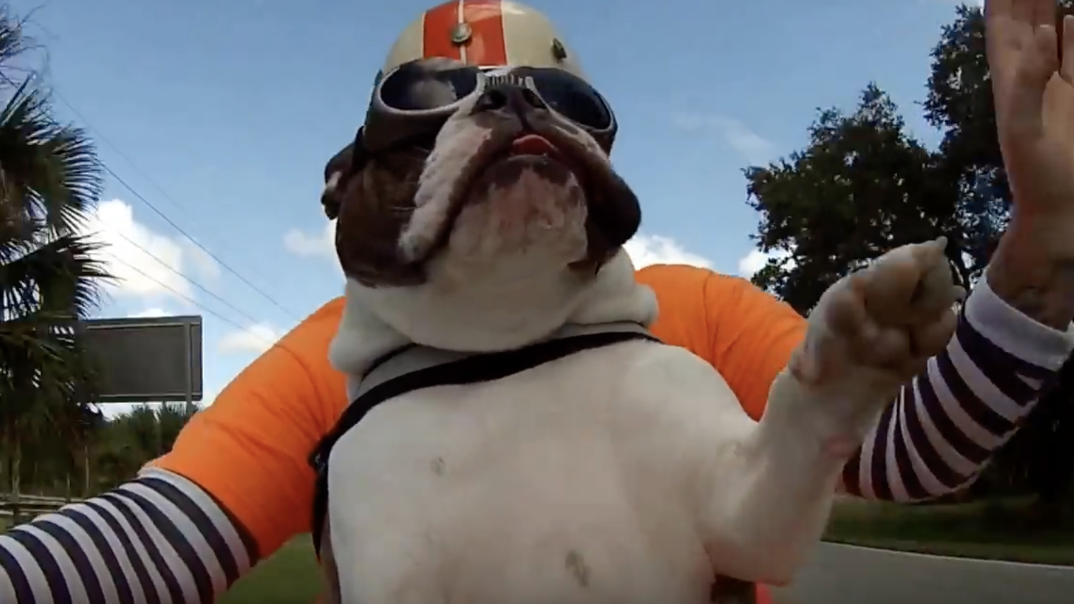 Sweets the English Bulldog is already bad to the bone riding along with her human on a motorcycle. Somehow though, she proved to be even cooler. As the two passed another biker, Sweets raised her paw on her own to wave.