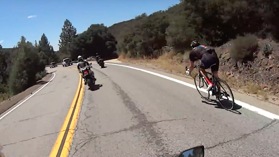 The footage was uploaded to YouTube by eyesonly760 with the description, "We got stuck behind some slow traffic on our ride... when suddenly, a wild cyclist appears!"