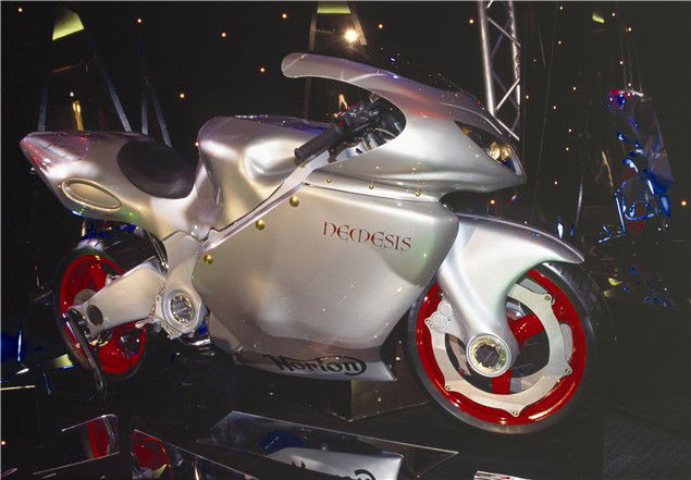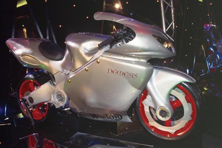 If it seems a little mean to send a bike to The Crusher that never really existed, just look at the specs. The Nemesis was always going to be a Straight-To-The-Crusher special: Push-button gearshift, rim-mounted brakes, 1,497cc, 60-degree V-8, 280bhp at 14,000rpm, 111ftlb of torque at 9,000rpm, three spark plugs per cylinder, 225mph, 202 kilos, magnesium swingarm, fork sliders and wheels, cameras for mirrors, jumpers for goal posts, and all for £30,000 a shot.