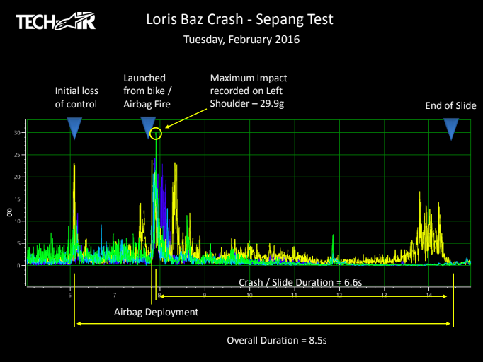 And in February 2016, during the opening MotoGP season test at Sepang in Malaysia Loris Baz suffered a tyre failure on his motorcycle. The resulting spill launched the Frenchman from his bike at 180+mph and he crashed to the deck, with an impact of 29.9Gs recorded on his left shoulder. But the Alpinestars Tech-Air Race airbag system meant that Baz suffered just a bruised elbow.