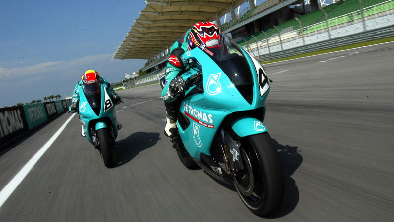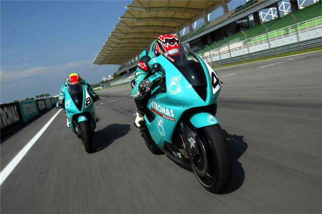 Budgets. Important. Money comes from Malaysian oil giants Petronas, who signed a five-year deal with Foggy to go racing in WSB and - just as importantly - build a rockin' road bike, Malaysia's first. Be proud, though, as it stems from Britain. By February and March of 2002, the team and Piper Designs had made the mock-up clay model and plonked it in the wind tunnel for testing.