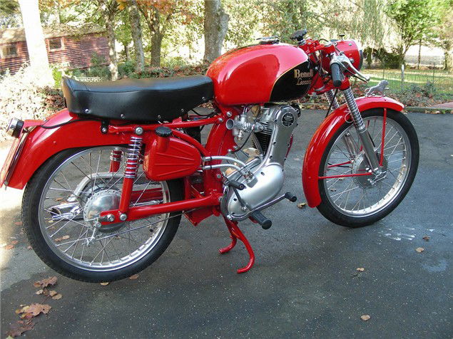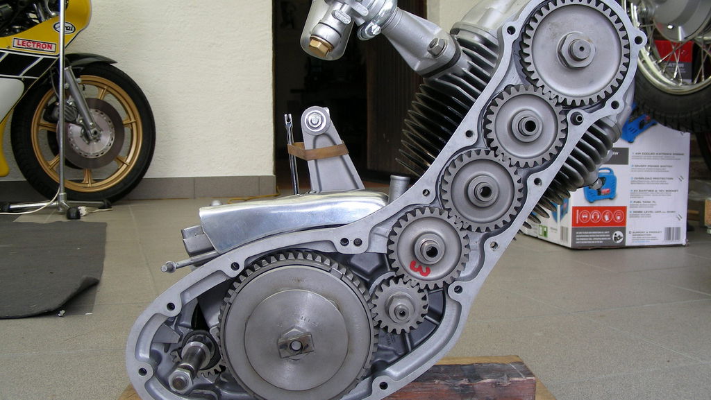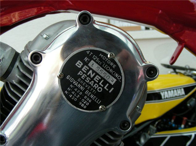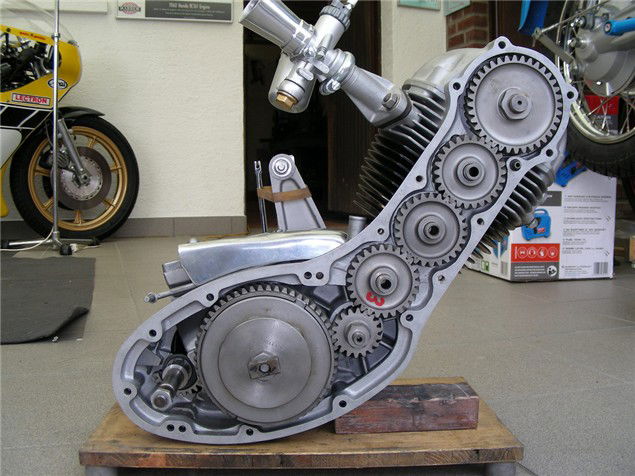 This 1950s engineering jewel is the Benelli Leoncino or, to translate, 'Little Lion'. The dinky 125 revved to a dizzy 18,000 rpm to make its slightly less dizzy 12bhp. It also featured a four-speed gearbox and nifty valve adjustment (rockers on eccentrics). But how beautifully proportioned are those neatly arranged gears to drive the single overhead camshaft? Work of art.