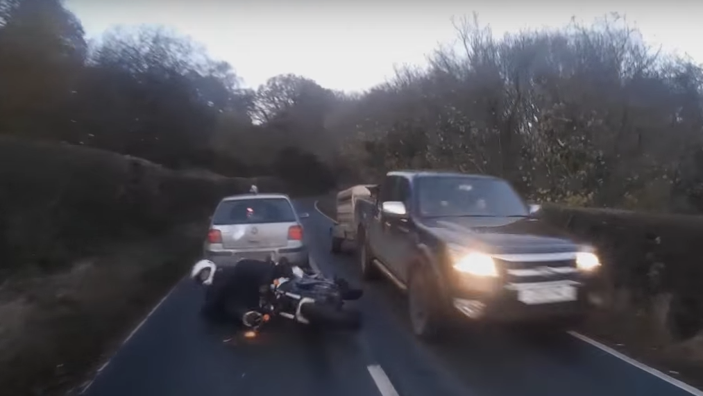 Driving a Volkswagen Golf, the motorist attempted to overtake three riders on a bend before cutting back into the lane to avoid an oncoming vehicle. The dangerous manoeuvre resulted in one of the motorcyclists flipping off of their bike after colliding with the rear of the car and narrowly missing an approaching pick-up truck. The reckless driver then evaded the incident by speeding off past the front rider who eventually chases after them.