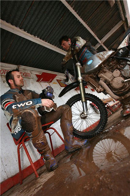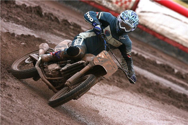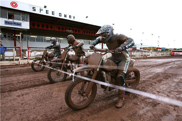 Throughout the day top flat trackers were on hand to demonstrate correct technique, then national flat track champion Lee Complin did a couple of demo laps on the full circuit. And crashed - but it was raining and there wasn't much grip at all. After all this we were allowed out onto the full track, one at a time, to get a feel. It was at this point I fell in love with flat track riding. Apparently instructor and all-round sideways ace Pete Boast could hear me laughing as I came past him.