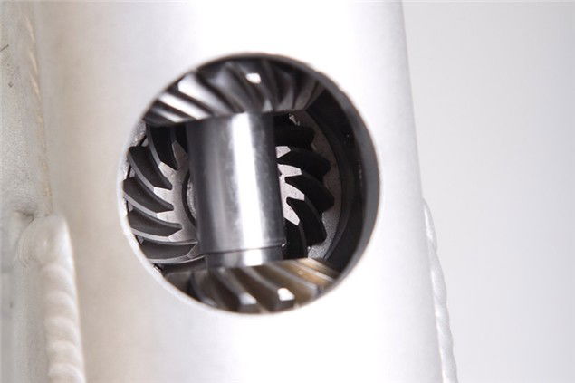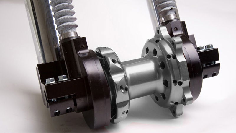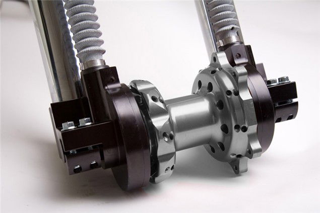 Any system that applies positive torque to the front wheel in a turn makes the bike lean in. That “steer-torque” complicated handling enough, so Christini decided to minimize the torque effects of his own system by using counter-rotating shafts, which cancelled each other out. Those two shafts also provide an unexpected benefit: they act as gyroscopic steering dampers, reducing the bump steer effects produced by other front-hub motors.