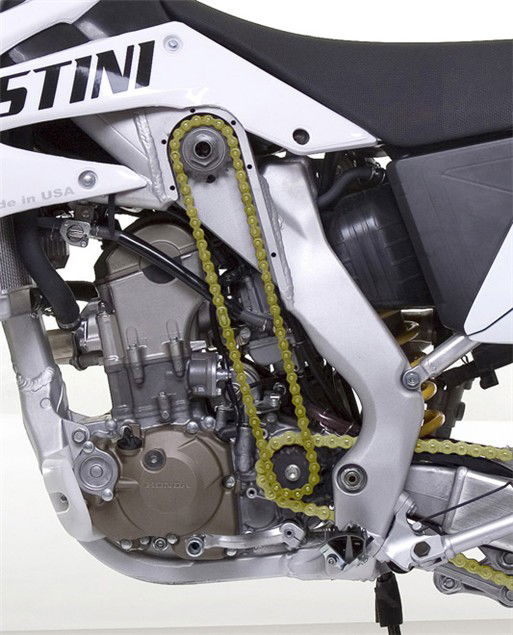 Christini-equipped bikes have a second drive chain, running from the countershaft to a point high on the frame beam. From there, a shaft transmits power under the fuel tank. Bevel gears in the steering head transfer power down the steering stem to the lower triple clamp. Two small drive chains in the clamp transfer power out to a pair of telescoping shafts, running parallel to the fork legs.