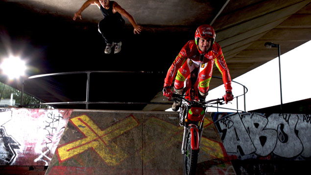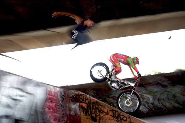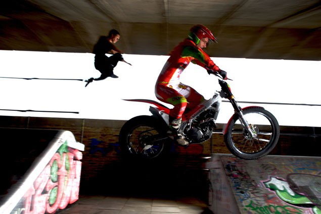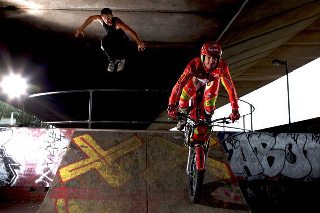 Jason Finn is legendary in the world of arena trials, and can ride his Montesa up or other anything you care to think of. So in a tight course through an urban setting, we set the two head-to-head. The venue was the skatepark under the A40 near Royal Oak tube station, London. The competition would involve both jumper and rider leaping from one ramp to the next over a 10 foot gap, then tackling a concrete take-off over a railing that easily stretched 15 feet into the air before landing down a rickety wooden ramp. Not possible for normal people, but neither of these guys are. A fall would result in a very nasty collision with the ground from a height.