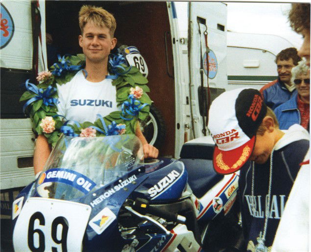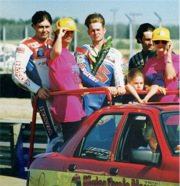 1991, on the victory car with Roger Burnett and Ron Haslam at Snetterton. MCN girls were shit in those days... the kid in front of me is a seven year old Leon Haslam. I can’t work out if that’s my hair or I’ve got a loaf of bread stuck to my head.