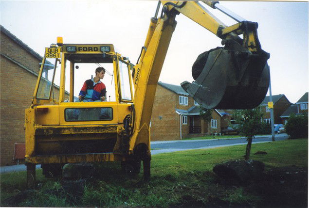 After a lean year racing in 1990 I decided to supplement my income and buy a JCB to do a bit of contracting. I practised a bit at home then put an ad in the local paper. This is my second, and as it turned out final job, as a digger driver, digging some footings for an extension in a local village. Seconds after this picture was taken I dug up and severed a gas pipe, cutting off the supply to several local houses. We called the gas board who duly came and fixed the pipe, and in return gave me a 900 quid bill and took me to court for being a daft c*nt! It could’ve been worse, I could’ve blown the street up.