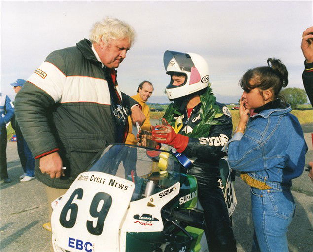 Darley Moor racetrack just after winning the ‘Stars of Darley’ race in 1987. The big bloke is the legendary Norrie White of MCN, the small, nervous bird in denim is my missus Andrea. We hadn’t been going out long and she still rather liked me at that stage!