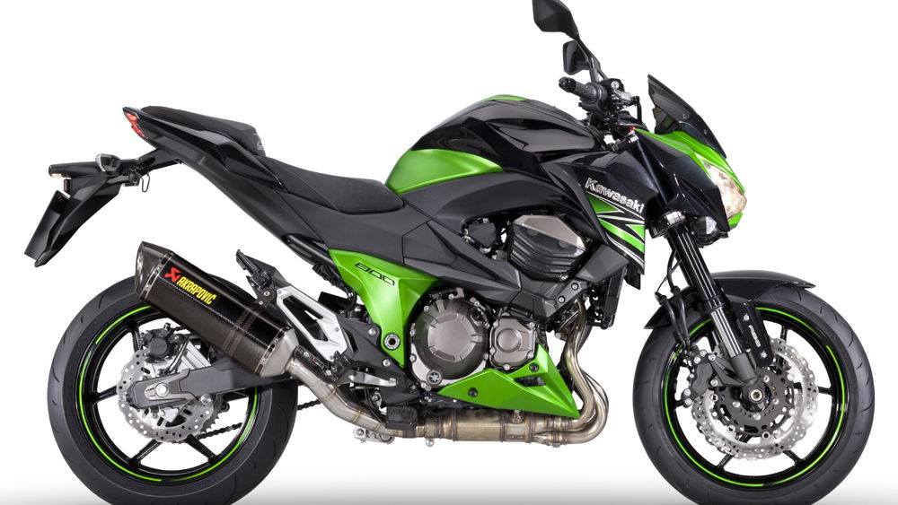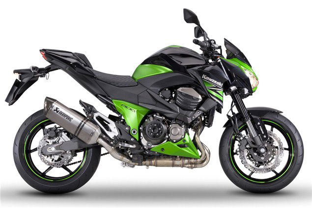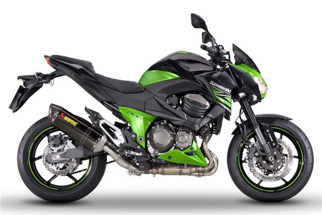 First up, this Z800 features a 'meter cover' otherwise known to you and I as a fly screen. It also features fork axle protectors (crash bungs) and engine guards (located on the engine casing by the clutch and gearbox). It also features a pillion seat cover and an Akrapovic Titanium slip-on exhaust.