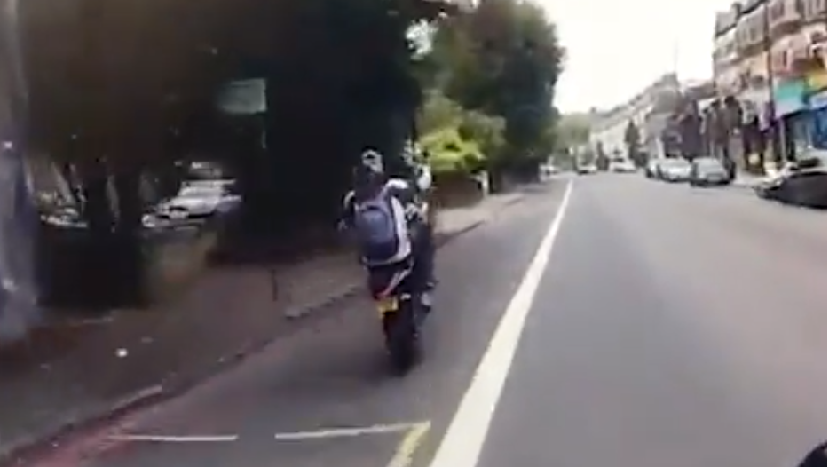 The rider is seen in footage from another motorcyclist's helmet cam, attempting the stunt on Archway Road in north London.