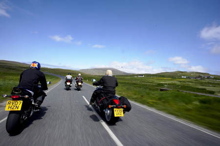 As soon as we set off on the bikes two things struck me. How good the deserted roads are and how breathtakingly beautiful the rugged, treeless landscape is. You're never more than two or three miles from the sea. One minute we were riding along a road clinging to a cliff-top, the next we were down at sea level crossing a spit of land connecting two islands, and with no trees, hedges, or stone walls you get a good view of the road ahead. The only things you have to keep an eye on if you want to ride really hard are loose gravel on some of the smaller roads, and the sheep. Most of the moor is unfenced and the only thing keeping livestock off the tarmac is the fact they can't eat it! Most of the older ones never flinch as you go by, it's the lambs you have to watch. And let me tell you, tough things are sheep. I once hit one on an X7 Suzuki when I was 17. As I climbed out from underneath my bent bike nursing a broken wrist I saw the offending ewe limp off to the other side of the road and carry on grazing.