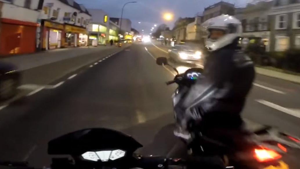 This footage was caught on Prenash Pillay's helmet-cam, and shows as a scooter rider pulls in line with his motorbike on a city road.
