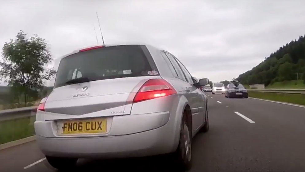 Captured on a motorcyclist's camera, this clip shows the moment a Renault Megane driver pushes his way between a layby and a queue of traffic to cut in front of the biker.