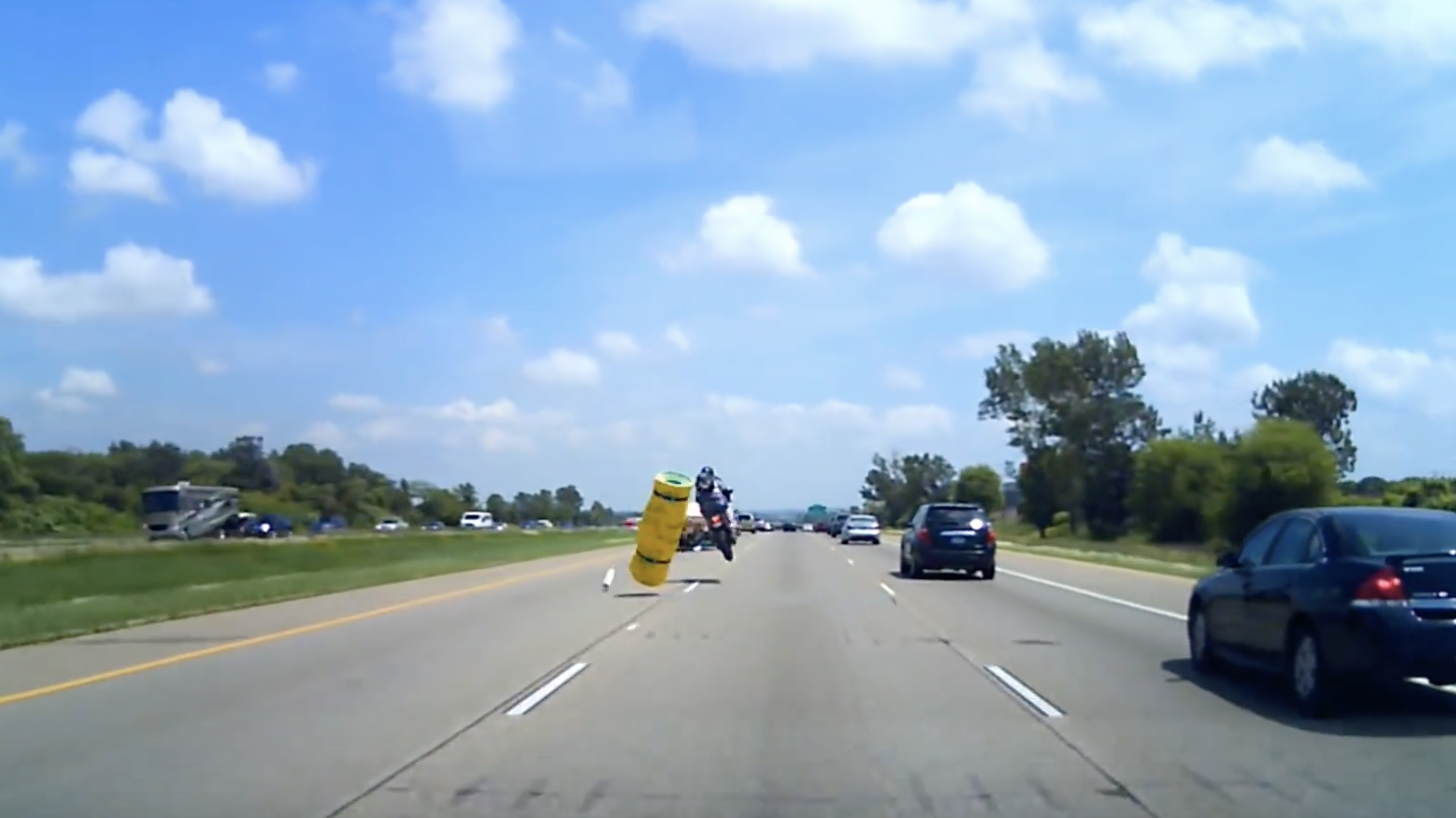 Motorcyclist wipes out after truck drops giant tube onto highway