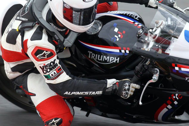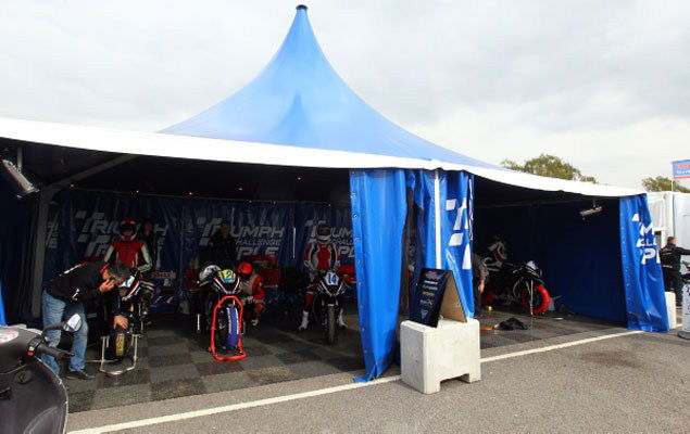 It doesn’t seem worth getting out of bed for an eight minute warm-up session but that’s exactly why I’m stood in the Triumph tent clutching a towel and a toothbrush at 7am. I’m met with a beaming smile from Paul one of the Triple Challenge organisers: the bike’s fixed. They sorted it. With the warmers on, I take a cold shower and with the worry of learning the track swept aside, I relish the thought of a few laps with a full-fat 675 and not a Daytona 450.