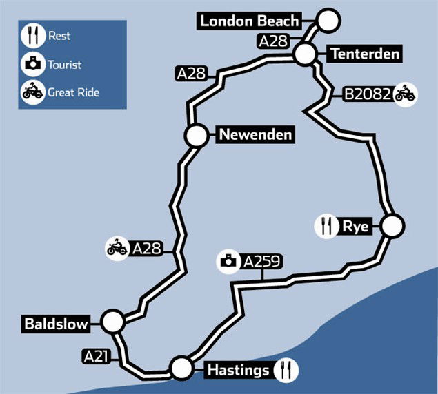 "This is a route me and a few mates do on a Sunday. As a couple of them come from Maidstone we meet at the junction of the A28 and A274 at London Beach just east of Tenterden in Kent. Both of those are good A roads that are not bad in their own right. My Maidstone mates think their road is the best, but the A28 is okay. It wakes me up in the morning.