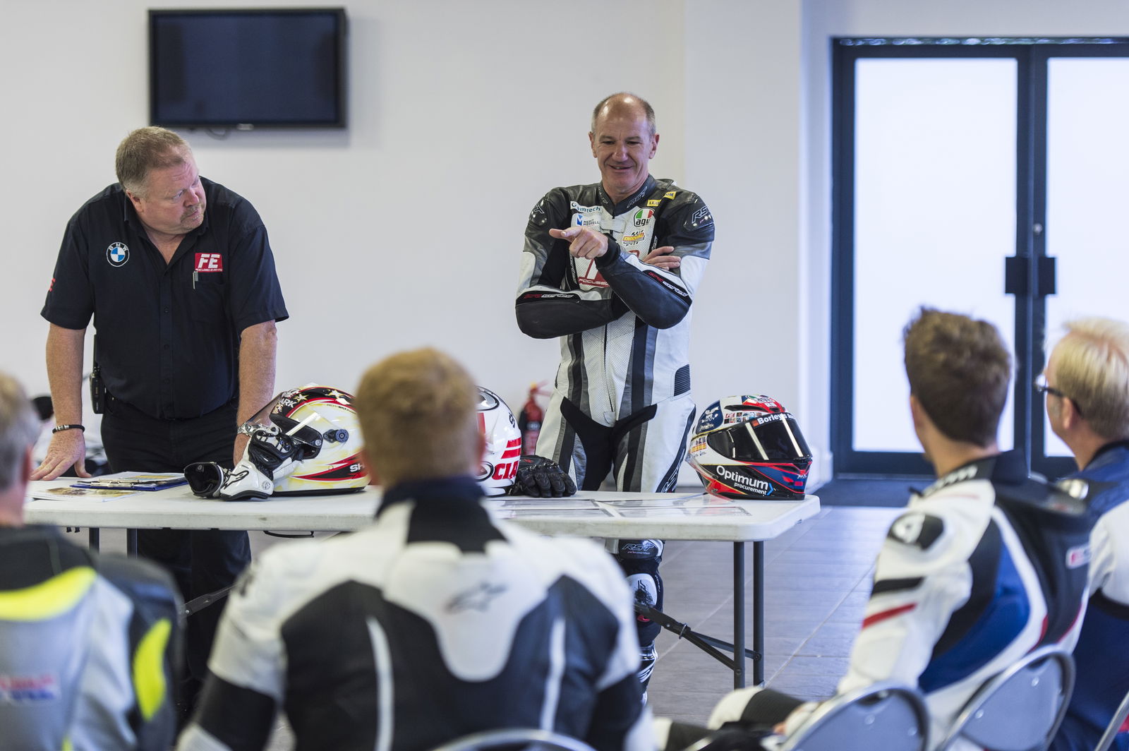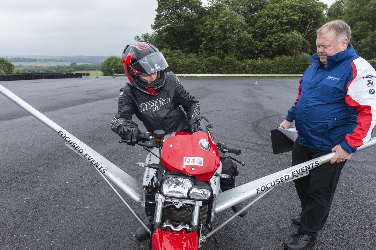 The day consisted of four track sessions on BMW S1000RRs plus exercises on Suzuki DR-Z125s and a BMW F800R fitted with enormous poles making it impossible to low-side.