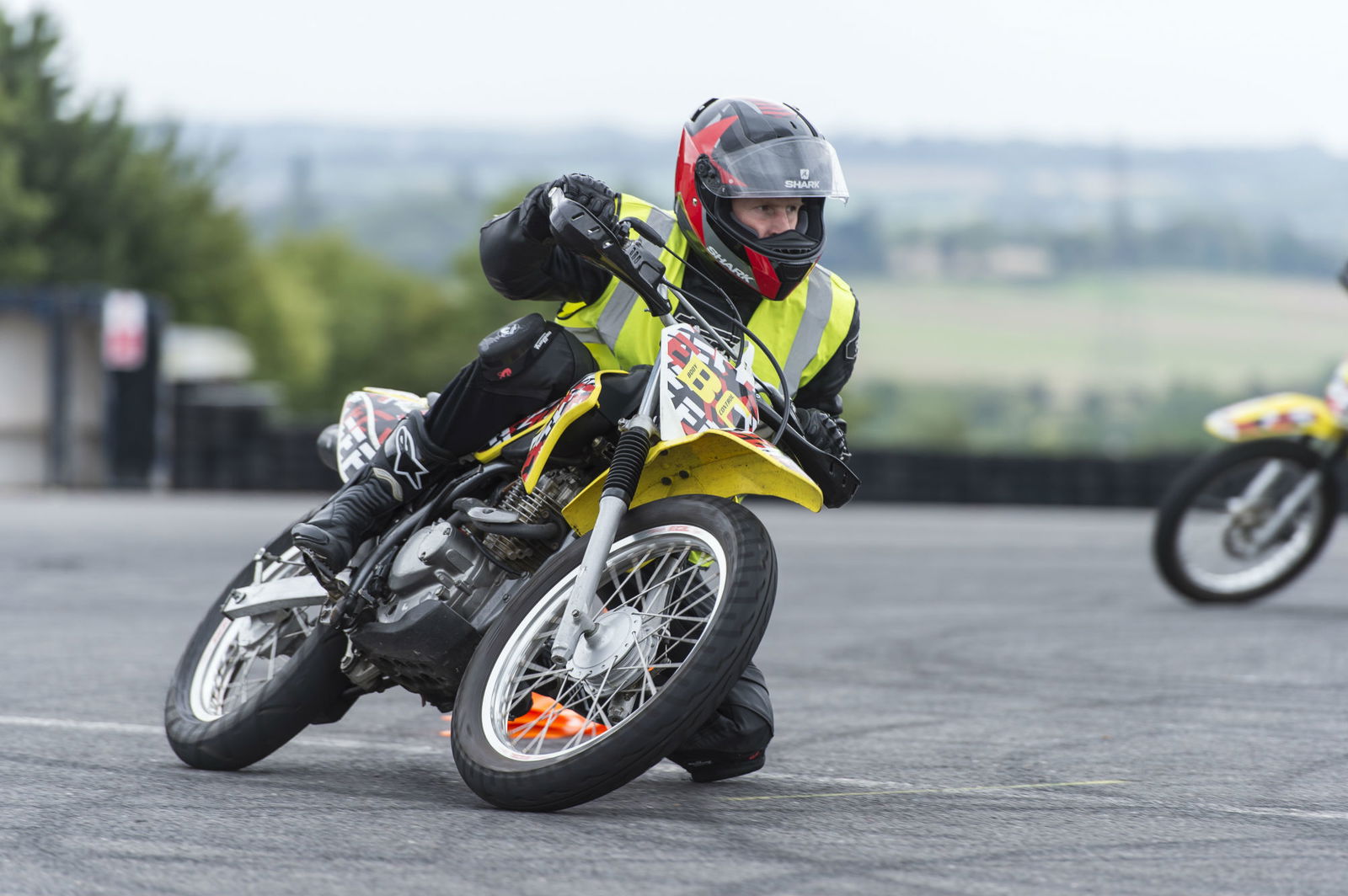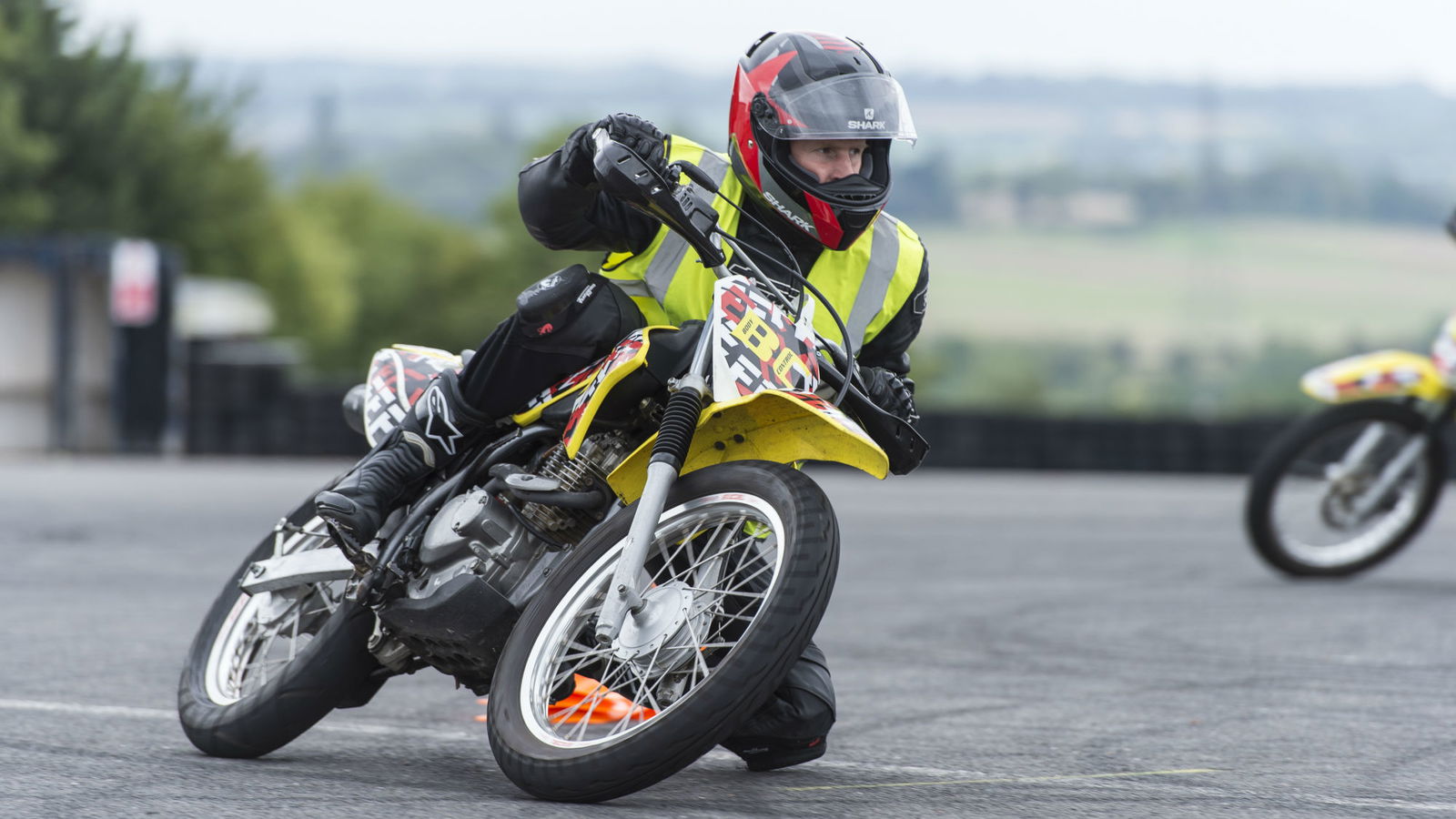 The DR-Zs are for teaching students about using their body position, in an environment where any crashes are likely to be relatively harmless. A twisty circuit is marked out on Donington’s wide-open ‘Tarmac Lake’. The instructor, Niall Mackenzie, tells riders how shifting their weight before a corner will help the bike turn.