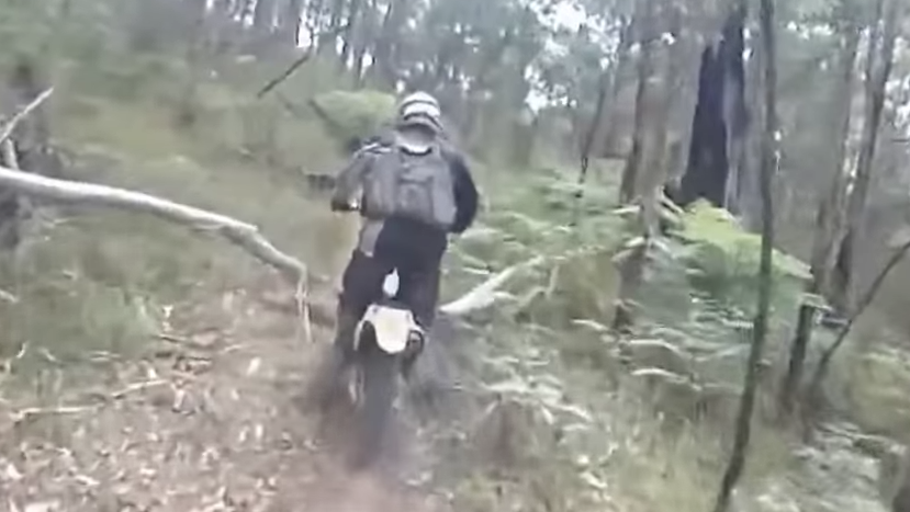 Recorded in Victoria, Australia, the clip shows a group riding through bushland as one rider attempts to cross a fallen tree, resulting in his leg being impaled. After taking a quick photo, the branch is then removed from his leg by the cameraman before the group rush back to their camp.