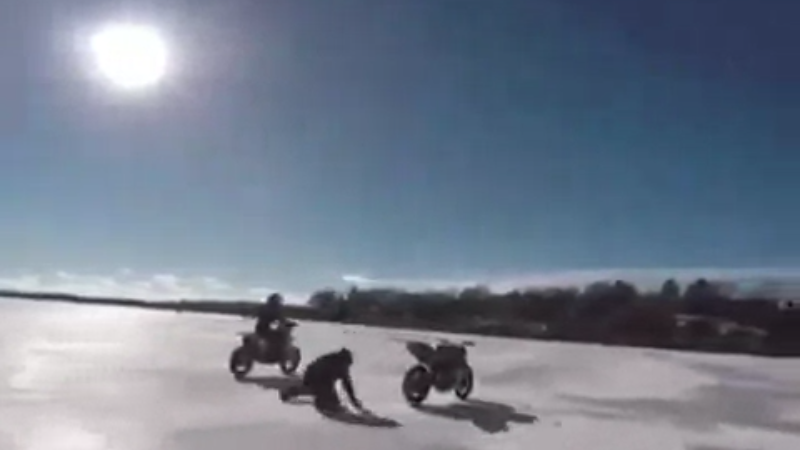 1. Motorcyclist falls over attempting to jump on his bike from behind.