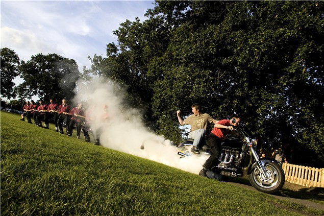We start with two pullers on the rope. With half-a-ton of Rocket putting down more torque than a Volkswagen Golf, the two don't stand a chance and the Triumph lunges forwards. Simple. With three on the rope, we give them time to dig their heels in and feed in the power. Ye gods, we're struggling. I've got three wiry men behind me on a two-inch thick rope and the Rocket is puffing hard. The rear starts breaking traction, JB bounces on the back and it grips again. The Triumph is howling, and we feel the resistance fade. We've beaten them, just.
