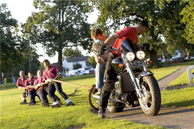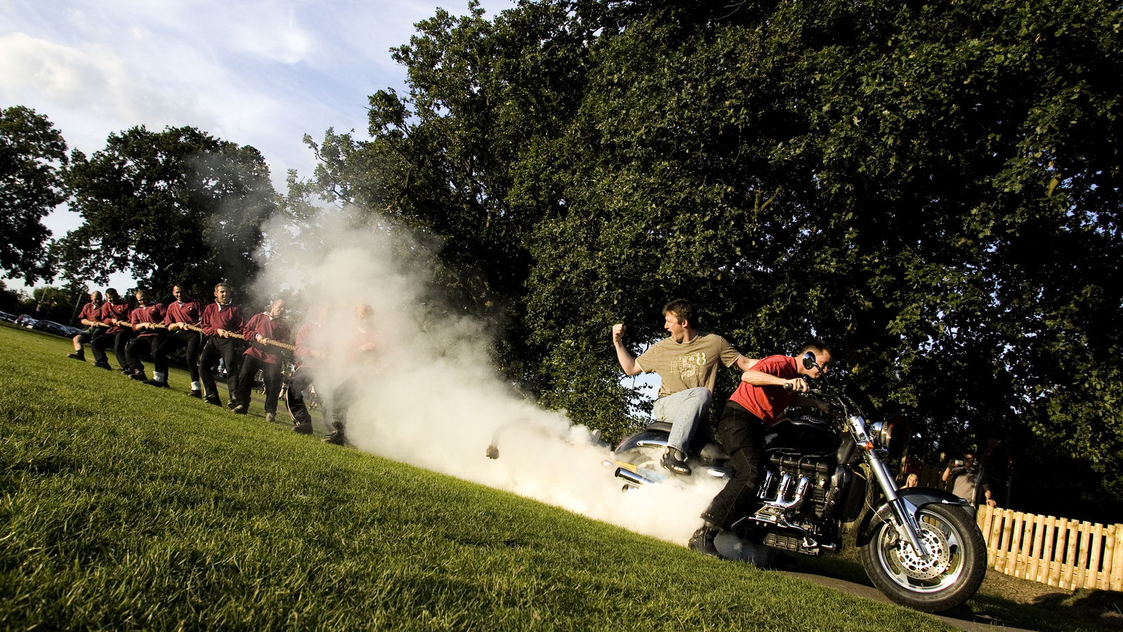 It's taken just four tug of war pullers to crush the heaviest, largest-engined motorbike in the world. "If you'd had eight fat blokes out of a pub, you'd have dragged them a mile up the road," grins Simon as the smoke clears and the stench of fried clutch dissipates. "But this is what these guys do, they're some of the best in the world."