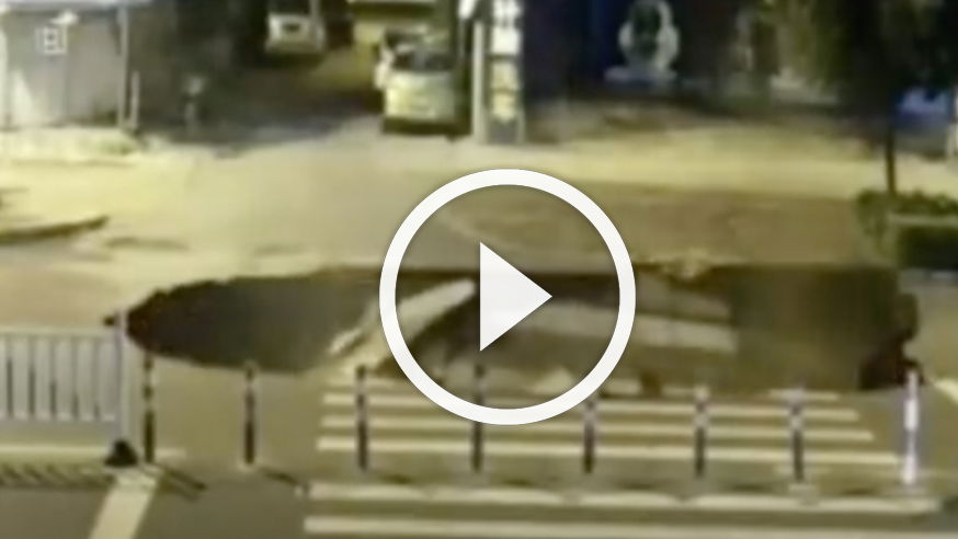 A MAN riding a scooter in China became victim to not paying attention and failing to see the huge sinkhole on the road. In turn he took a nose dive, managing to escape with only minor injuries.