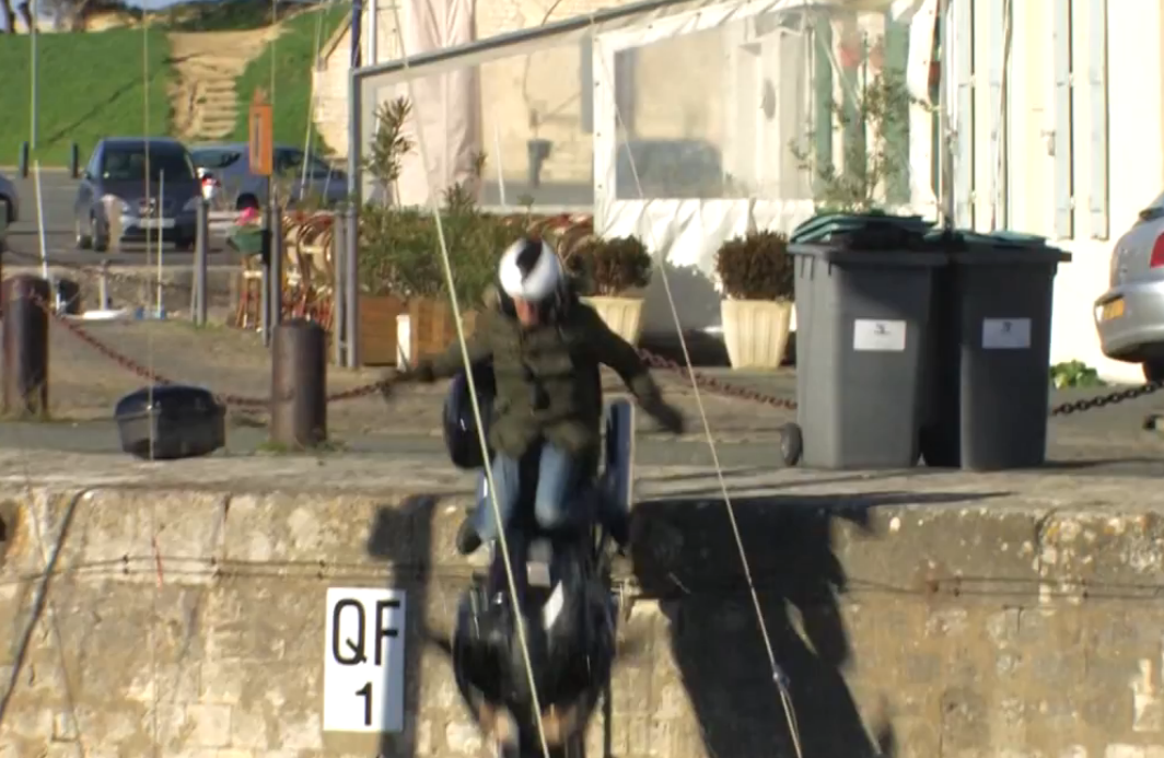 The video shows Swedish army issue Husqvarna 258's (1981) fitted with 'ski-stabilisers'. The riders put their feet on the skis and slide in confidently, despite the snow and ice.