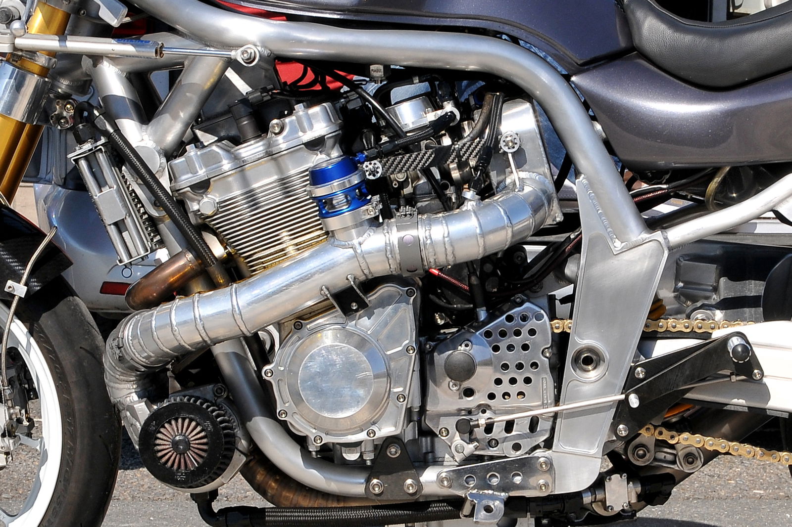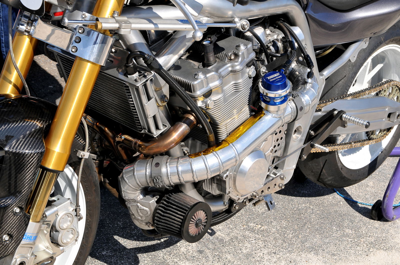 Exuding an air of brutal menace was Colin Stannard's Spondon-framed Suzuki Bandit. The GSX-R1100 motor is punched out to 1340cc, and has a TTS flowed head plus Yoshi Stage 1 Cams, with the obligatory Carillo rods keeping everything inside the cases. A GSX-R lock up clutch takes care of power transfer which is boosted by the addition of Colin's beautifully crafted self-made blow-through turbo system.