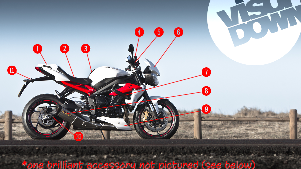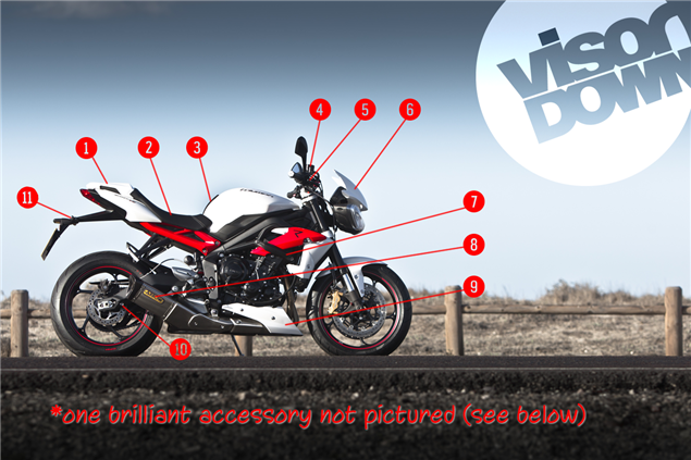 Is the 'standard' Street Triple R not unique enough for you? Here are a few of Triumph's accessories to help you tweak it to suit your taste.