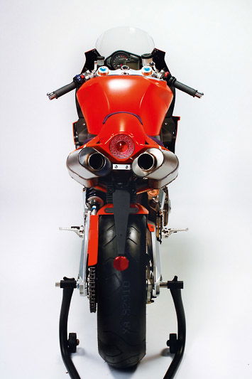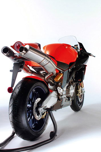 Originally shown as a concept bike, with slick tyres and no lights, the SFC quickly moved towards limited production. Based around the 141bhp Aprilia RSV-R engine, it was a relatively simple job to knock-up a new, tubular steel chassis and some odd-looking bodywork, and by mid-2003 road-going prototypes were out testing in preparation for the ‘production’ version’s launch at the end of the year.