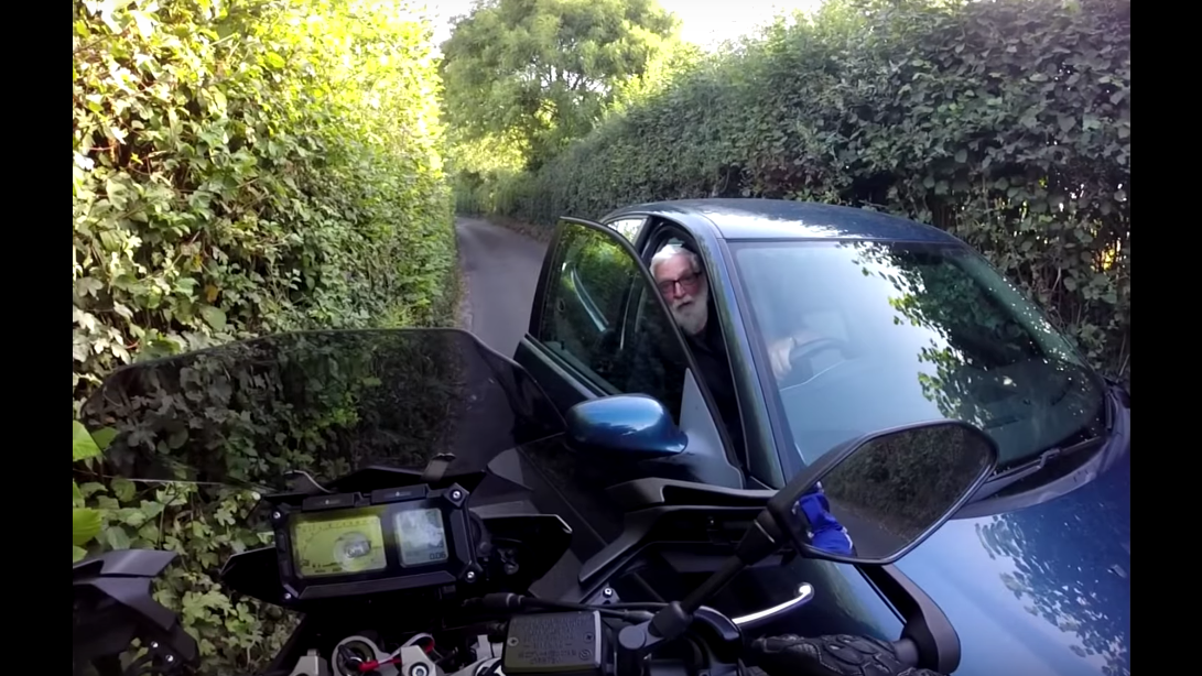 THIS DRIVER was met with the difficult challenge of passing a motorcyclist on a narrow road. His blood pressure must have risen fast when he was told repeatedly that the bike couldn't reverse. Nevertheless, kudos to the biker for keeping his cool.