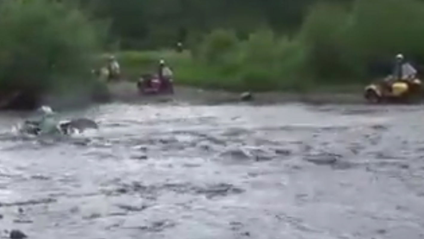 At one stage the water completely submerges the bikes but the undaunted riders keep the throttle pinned and somehow navigate safely to the bank.