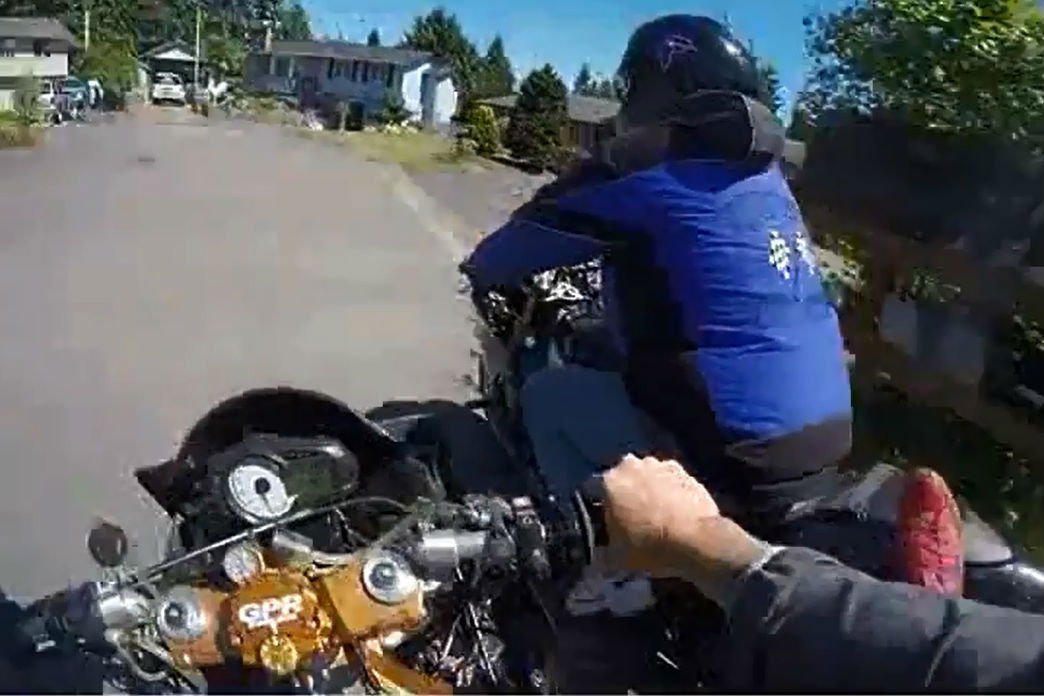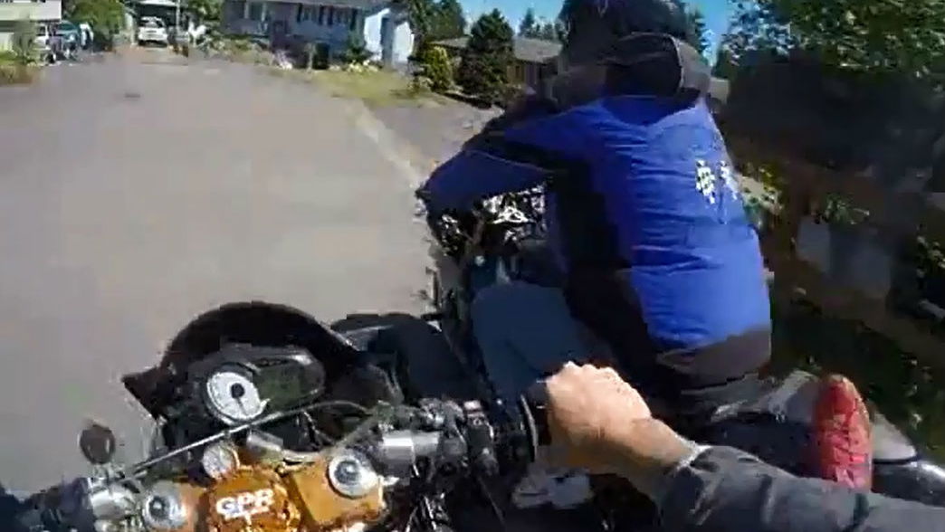 THIS video purports to show a motorcycle thief getting payback from a rider who chases him and kicks him off a stolen machine.