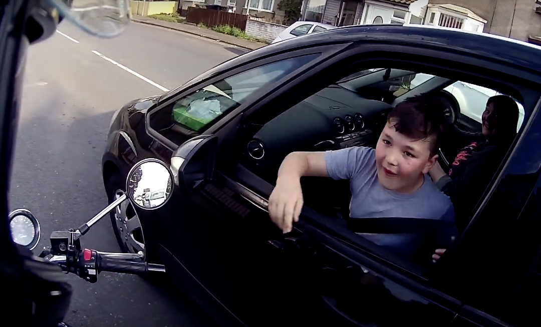 The footage shows a young boy and his Mother were caught gazing at a rider's bike at a set of traffic lights.