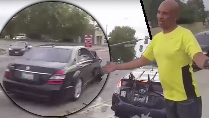 RECORDED in California, the footage shows a driver slamming into several cars before speeding off. The motorcyclist chases after him in pursuit of the suspect.