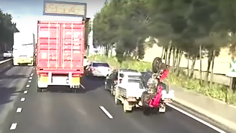 Video: Motorcyclist lands bike in pickup truck