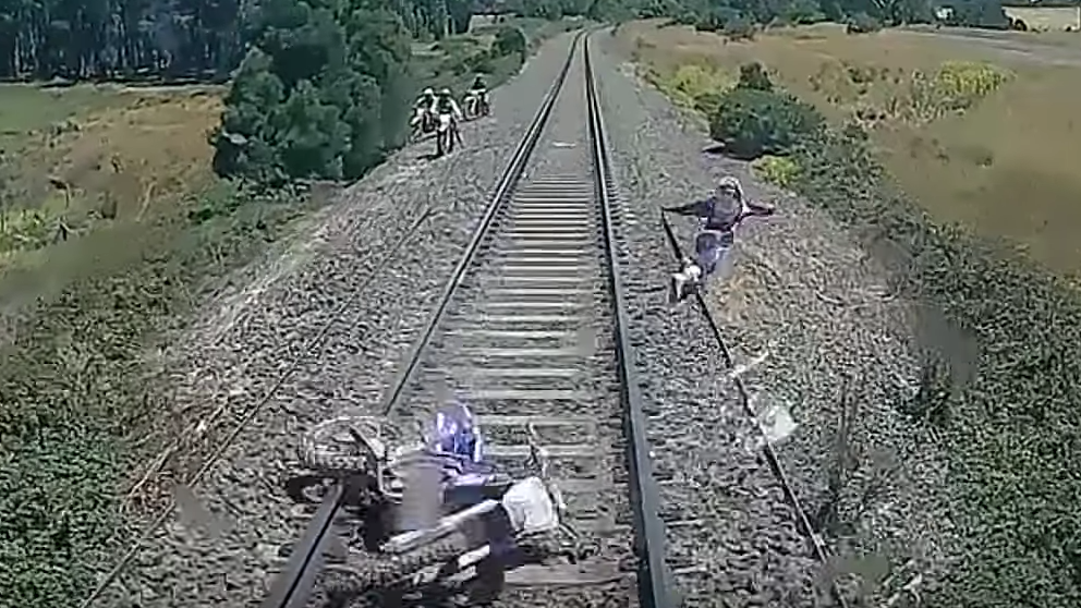 Travelling at speeds close to 100mph, the Ballarat bound V/Line train approaches the rider along with his bike, which appears to be caught on the tracks. The lucky trespasser narrowly escapes the collision by throwing himself through the air but unfortunately the same can't be said about his bike, which disappears under the train.
