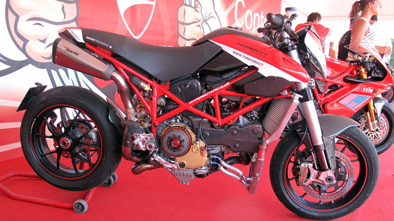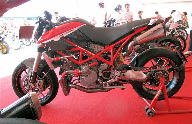 As well as the beefy engine, the Hyper Evo TS features gas-pressurised forks and Brembo monobloc brakes. Other touches include the custom-made exhausts and although it's missing the 'beak' of the Hypermotard, the bodywork has been custom made.